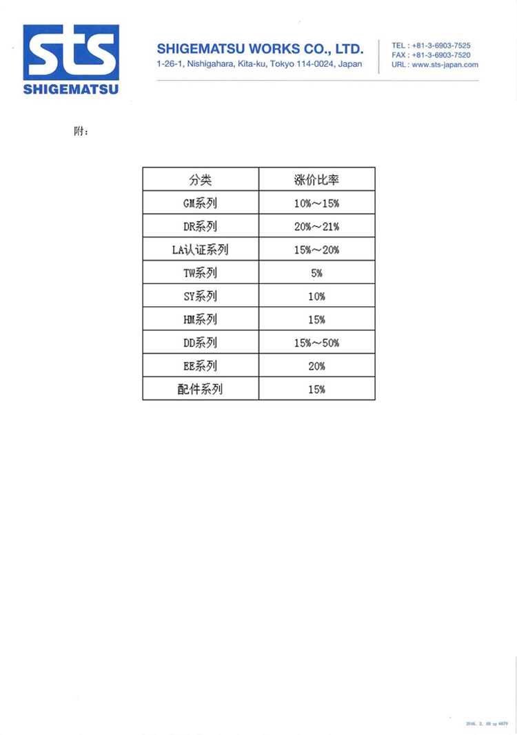 因受新冠疫情的扩散影响以及日本海内原质料价格、人工本钱以及运输用度的大幅上涨,重松制作所将于2020年12月1日起的订单进行价格调解。我司也将在同一时间调解价格,