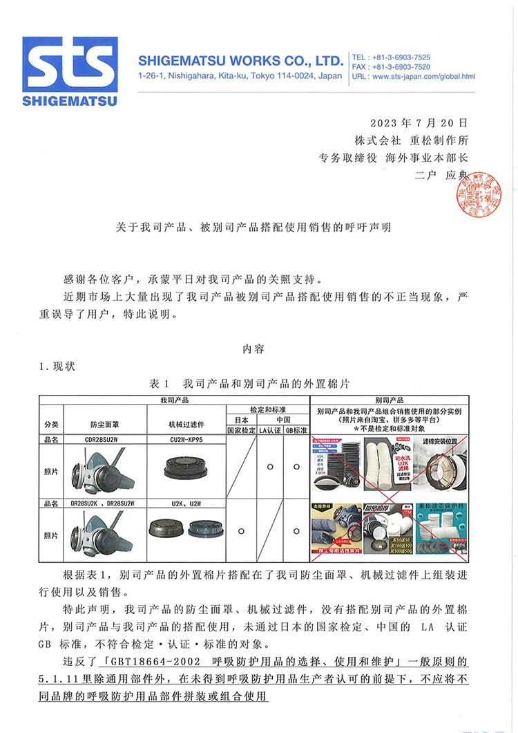 重松产品不宜添加其他品牌外置棉片的呼吁声明